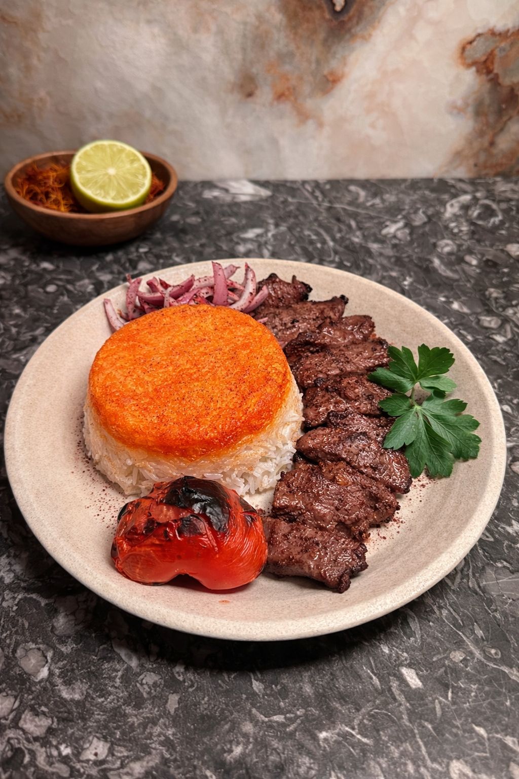 Cubed beef with golden tahdig
